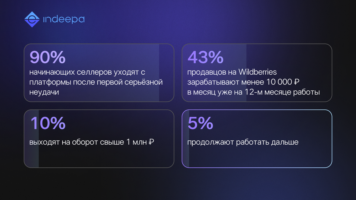 А 90% начинающих селлеров уходят с платформы после первой серьёзной неудачи. Лишь 5% продолжают работать дальше.