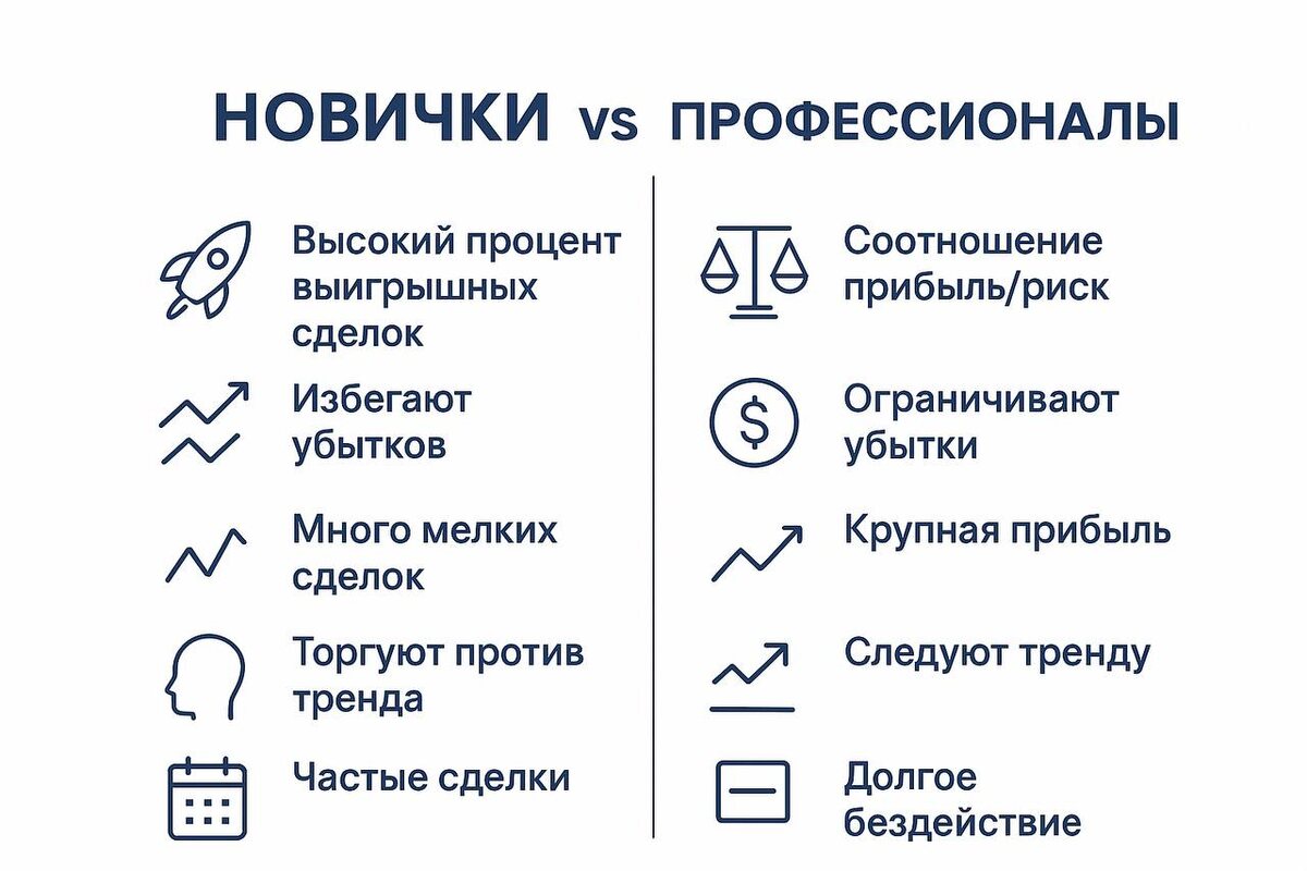 В инвестициях результат зависит не от количества сделок, а от качества мышления. Посмотрите, чем отличаются подходы новичков и профессионалов: 🔹 Новички: • Гонятся за высоким процентом выигрышных сделок (>60%) • Избегают убытков, но ограничивают прибыль • Делают много мелких сделок ради «движухи» • Торгуют против тренда, пытаются поймать дно или вершину • Решения принимают на эмоциях и по прошлому опыту (особенно, если пару раз повезло) • Риски растут вместе с убытками 🔹 Профессионалы: • Смотрят на соотношение прибыль/риск, а не на процент сделок • Дают прибыли расти и режут убытки коротко • Держат убытки маленькими, а прибыль — крупной • Следуют тренду, не борются с рынком • Работают по системе, автоматизируют процессы 💡 Главное отличие: Новички ищут «идеальные входы» и стабильные выигрыши. Профессионалы строят систему, где убытки — часть игры, а крупные выигрыши перекрывают всё.