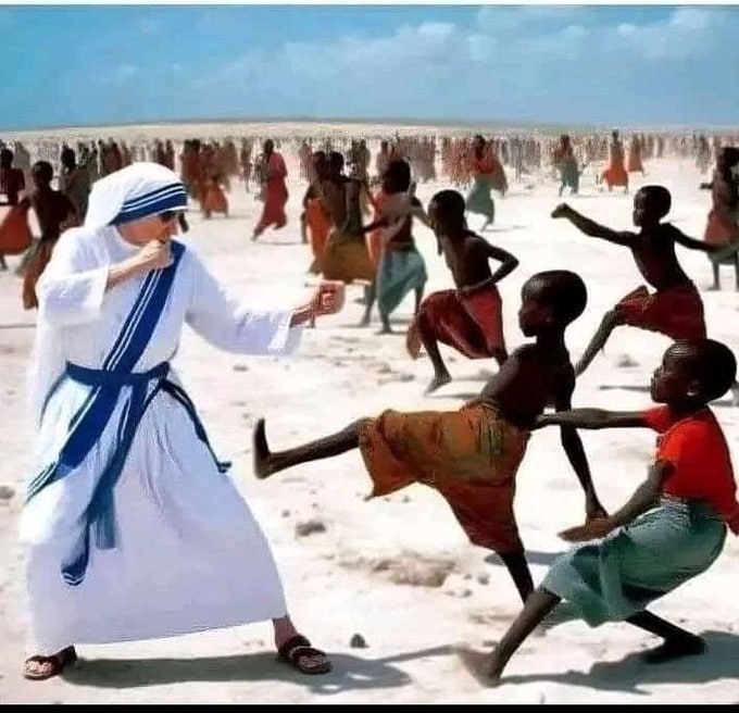 Нейросеть снова удивляет! Она сгенерировала необычное изображение: "мать Тереза борется с бедностью