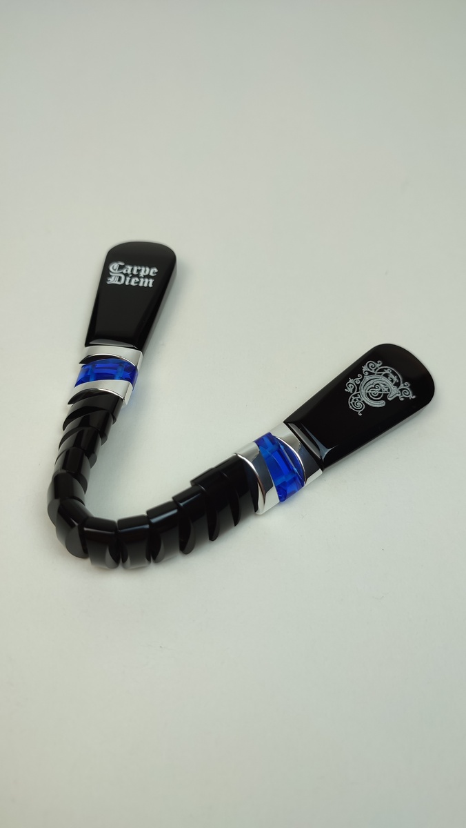 Визуал более спокойный, холодный синий оттенок подчёркивает сдержанность и баланс. На концах — гравировка: лаконичное Carpe Diem с одной стороны и серебристый орнамент с другой. Чётки, в которых собраны контраст и спокойная гармония — одновременно.