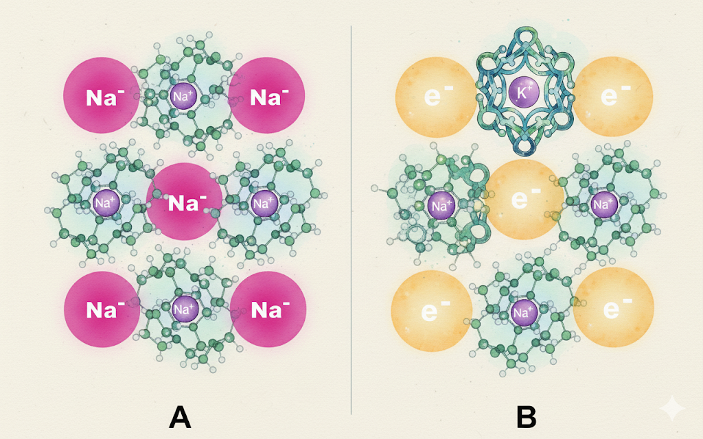 Вся школьная химия построена на простой идее: в солях, таких как NaCl, всегда есть положительный ион (катион) металла и отрицательный ион (анион) неметалла. Эта догма кажется незыблемой. Но в тишине лабораторий, вдали от школьных досок, существует химия, которая ломает это правило с особым изяществом. Это мир алкалидов — солей, где анионом является атом металла. И мир электридов — еще более странных солей, где роль аниона выполняет сам электрон. Чтобы понять гениальность открытия, нужно понять сложность задачи. Щелочные металлы (литий, натрий, калий) — самые электроположительные элементы. Они с невероятной легкостью отдают свой единственный валентный электрон. Заставить такой атом принять чужой электрон — задача, которая кажется абсолютно невыполнимой. Это все равно что заставить воду течь вверх. Нужен был некий «насос», который бы создал условия, где у металла просто не останется другого выбора. И такой «насос» был найден. Ключом к созданию этих невероятных соединений стало изобретени