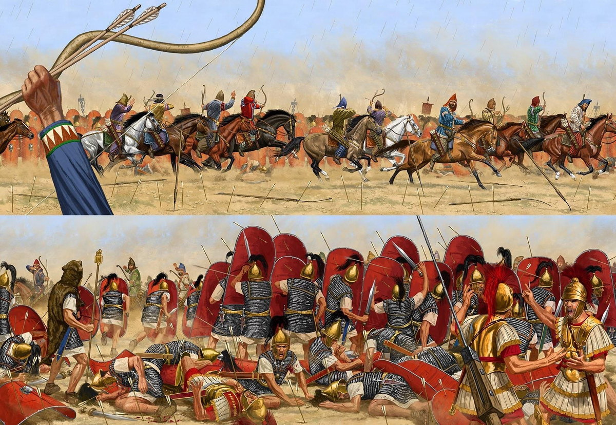 Парфяне хорошо владели тактикой притворного отступления. Конный лучник, отступая, разворачивался в седле и стрелял назад в преследующего противника. Суть тактики более подробно: