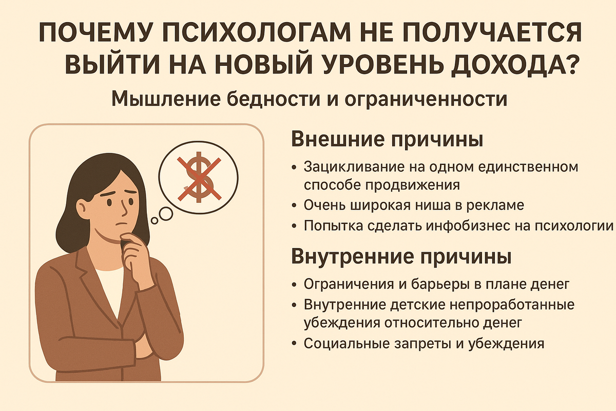 Многие психологи ведут своих клиентов к тому, чтобы увеличить финансовое благосостояние. Они помогают им снимать ограничивающие установки и убеждения, которые заложены глубоко внутри. Но при этом зачастую сами не до конца проработали свои собственные внутренние установки и убеждения, которые мешают и блокируют выход на новый уровень дохода. Например, психолог, зарабатывающий 120–150 тыс. руб. в месяц, хочет выйти на 250–300+ тыс. руб. в месяц, но у него не получается, что бы он ни делал. Давайте разберём внешние и внутренние причины этого довольно популярного явления. Внешние причины: