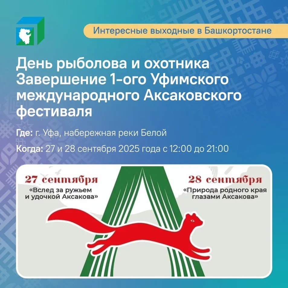 В выходные, 27 и 28 сентября, в Уфе завершается 1-й международный Аксаковский фестиваль. Любимые занятия Сергея Тимофеевича – на набережной реки Белой в День рыболова и охотника. Гостей ждут: чемпионат по рыбной ловле с баржи и берега, торговые ряды товаров для активного отдыха, битва шеф-поваров по приготовлению ухи, тематические фотозоны и ремесленная ярмарка с изделиями ручной работы. Вход свободный, начало праздника в 12:00. XXXV Аксаковский праздник – в Белебеевском районе 27 сентября. Возложение цветов, открытие воскресной школы на территории Дмитриевского храма, посещение усадьбы и фольклорный праздник. В Центральном Дворце культуры – презентация книги, книжная выставка и литературно-музыкальный праздник. В Благовещенске в субботу, 27 сентября – фестиваль семейной рыбалки. Соревнования проводятся в 1 тур, можно использовать прикормку, ловля рыбы производится на поплавочную снасть одной удочкой на одного участника, учитывается любая пойманная рыба. Подробности - здесь. Республ