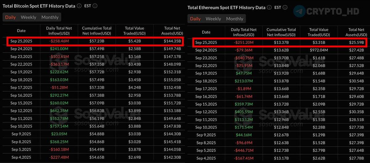 Bitcoin ΠΈ Ethereum ETFβ¦ Π§ΠΈΡΡΡΠΉ ΠΎΡΡΠΎΠΊ Π·Π° Π²ΡΠ΅ΡΠ°ΡΠ½ΠΈΠΉ Π΄Π΅Π½Ρ: βͺ#ETH = -$251,200,000. βͺ#BTC = -$258,460,000. Crypto Headlines