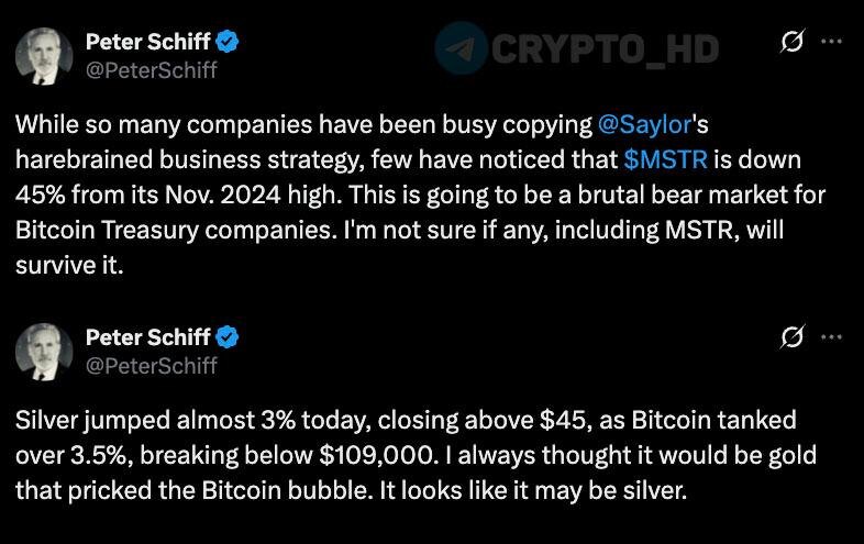 😐 Питер Шифф продолжает пророчить крах BTC и Strategy… Из-за бездумного копирования BTC-стратегии Майкла Сэйлора многие не заметили, что акции MSTR просели на 45% c максимума ноября 2024 года. Не думаю, что компании с BTC-резервами переживут этот медвежий рынок. Серебро подскочило почти на 3%, закрывшись выше $45, тогда как Биткоин обвалился ниже $109,000. Я всегда думал, что именно золото проколет Биткоин-пузырь. Похоже, это может сделать серебро (twitter) Ранее: - ETH и медвежий рынок - BTC не оправдывает хайп - медвежий фактор - BTC за $75k Crypto Headlines