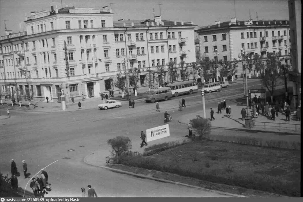 Вид на Советский проспект 1967 г В центре здание магазина Лакомка с адресом пр. Советский 34. На проспекте видно трамвайные пути (по данному проспекту в тот период ходили трамваи). Улица Кирова, пересекающая пр. Советский разделена зеленой зоной, где отчетливо видно рекламу фильма "Начальник Чукотки". Неподалеку располагается здание кинотеатра Москва. Источник:https://vk.com/kemerold Адрес точки съемки:С возвышенности (из окна пр. Советский 43) На ул. Кирова даже клумба была. Год постройки 1952 "Первый универсам" (ранее гастроном №16), открылся в Кемерове в феврале 1953 года, на пересечении улицы Кирова и улицы Советская (ныне проспект Советский). Магазин был укомплектован новейшим оборудованием и являлся образцом советской торговли в Кузбассе. В окнах магазина были установлены неоновые вывески, залы украшены хрусталем. На момент открытия, "Первый универсам" был самым крупным предприятием торговли подобного формата, от Урала и до Владивостока.
