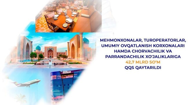 По состоянию на 25 сентября 2025 года сумма возмещённого НДС составила 42,7 миллиарда сумов. Возврат был произведён в пользу предприятий, представляющих туризм, гостиничный бизнес, сферу общественного питания, а также животноводческие и птицеводческие хозяйства. В частности: