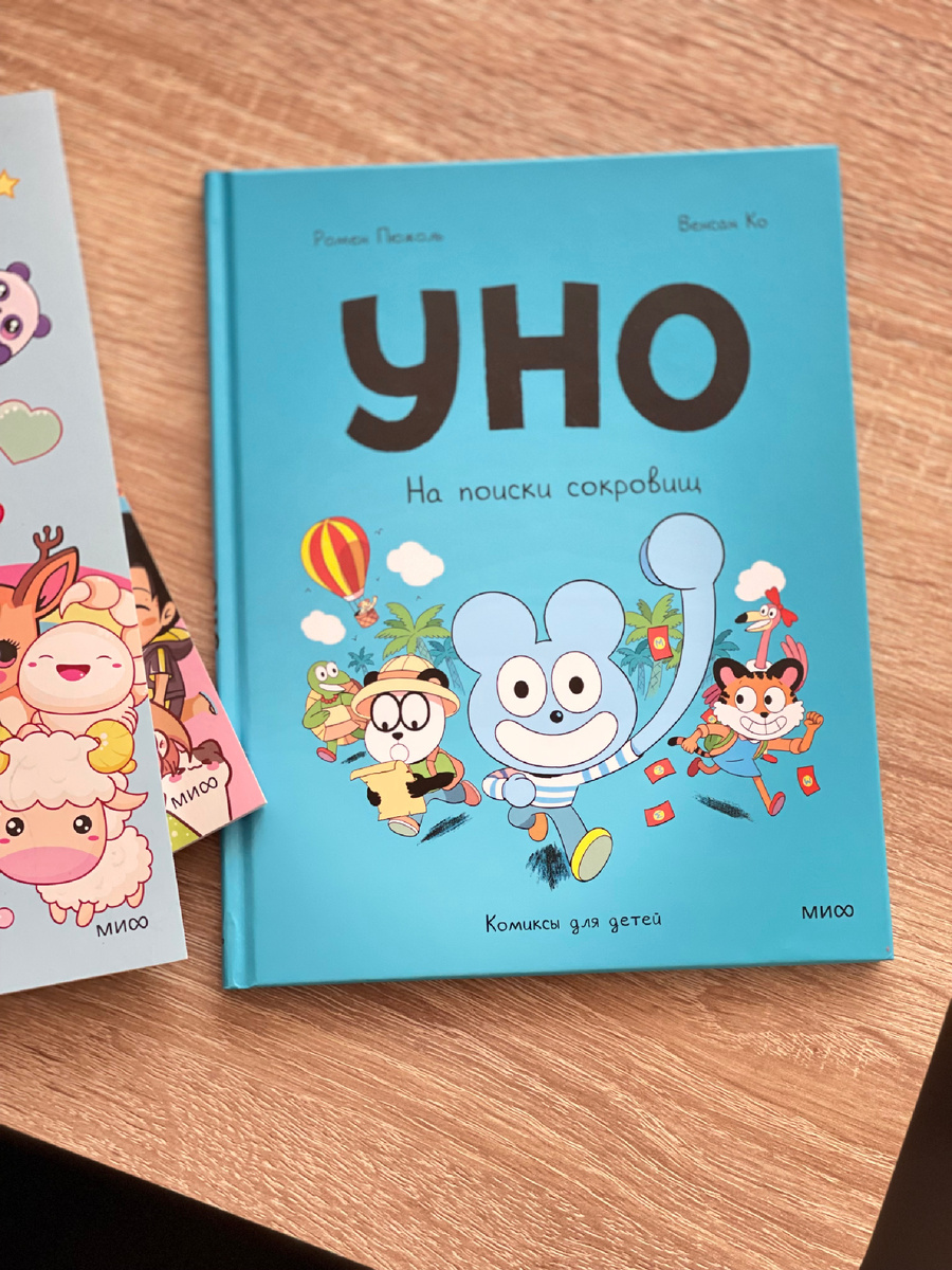 Он — не просто герой комикса, он — настоящий генератор смеха и приключений! Уно — такой друг, который всегда готов выручить, рассмешить и втащить вас в историю, где скучать точно не придётся. Вообще, начинать читать именно с комиксов — это очень правильно и полезно. Текст в них короткий, диалоги простые, а картинки сразу включают воображение. Например, умение читать не только слова, но и смысл изображений напрямую связано с будущей успешностью в учёбе. Такие книги отлично тренируют внимание, память и фантазию. Ребёнок учится не просто читать, а «видеть историю» целиком: эмоции героев, их действия, настроение сцены. Это развивает креативность, творческое мышление и даже помогает в письме — дети начинают сами придумывать сюжеты. Картинки яркие, диалоги короткие, читать легко и весело. Дети обожают: то кто-то свалился в воду, то спорят из-за пустяка, то находят неожиданное решение. Читаем всей семьёй и хохочем — будто сами оказываемся в компании Уно. И самое важное — это не только смешны