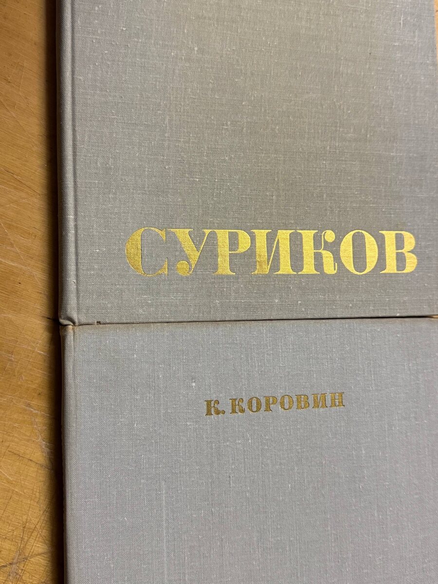Два красавца: Суриков и Коровин, книжные братья. Обе книги были выпущены в 1970-х, издательством «Искусство» и имеют абсолютно одинаковые параметры длины, ширины и высоты, а также материалы исполнения: серую ткань переплета с золотым тиснением, которое особенно эффектно выглядит на огромных буквах Сурикова.