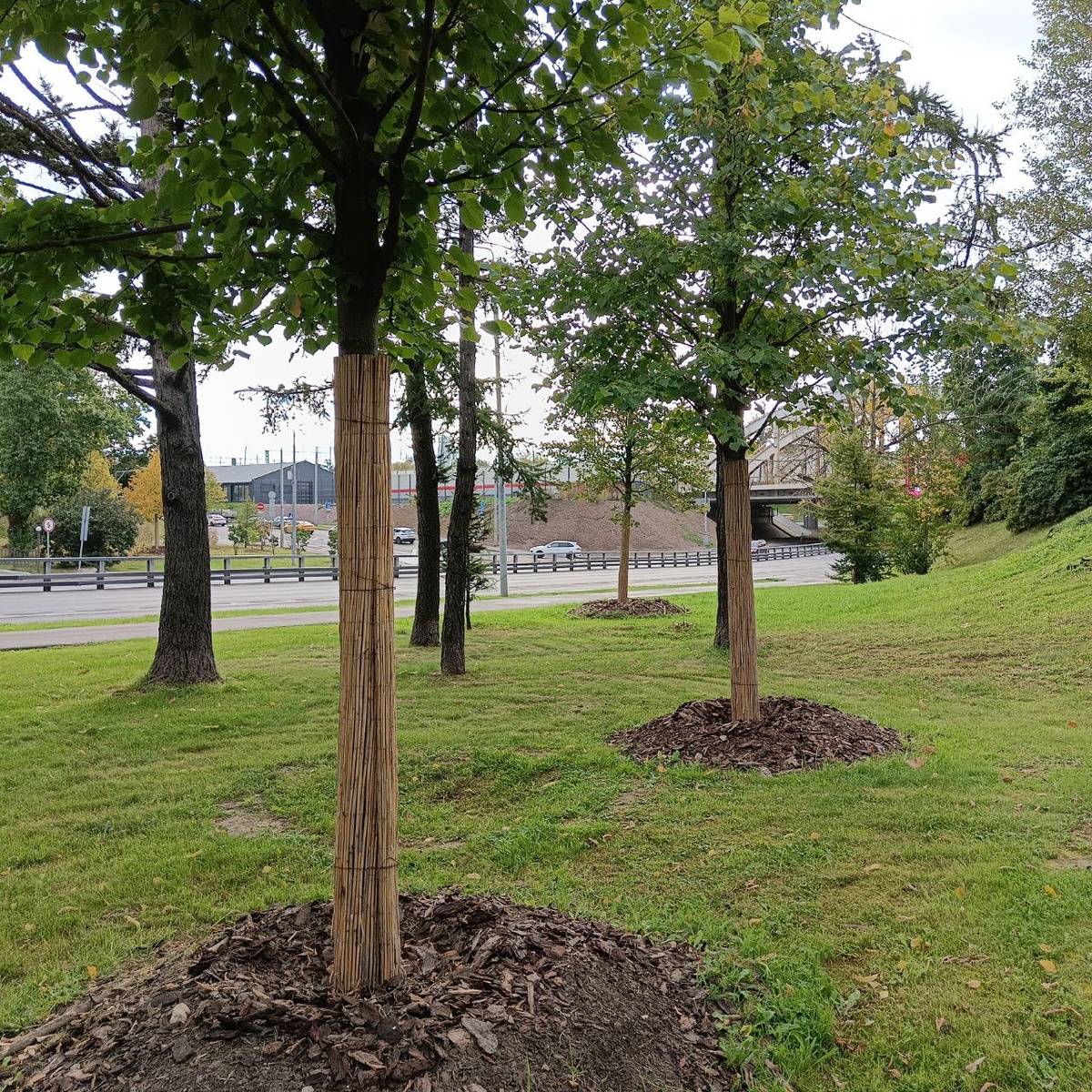 Обмотка Наблюдаю всё чаще, что ствол некоторых деревьев обмотан бамбуком. Понятно, когда стволы красят известью, то это от вредителей. А тут для чего? Оказывается, это обмотка имеет своё название – тростниковые маты. И нужны они для: 🟣Защиты дерева от неблагоприятных погодных условий и в частности от ветровых нагрузок, чтобы не сломалось от порывов ветра. 🟣Предохраняют стволы от образования морозобойных трещин (глубокие трещины от перепадов температур длиной до 1 метра и более), что ослабляет дерево и оно может погибнуть. 🟣Позволяет укрепиться свежевысаженным, ослабленным, неокрепшим деревьям, особенно если рядом магистрали и оживлённые улицы.