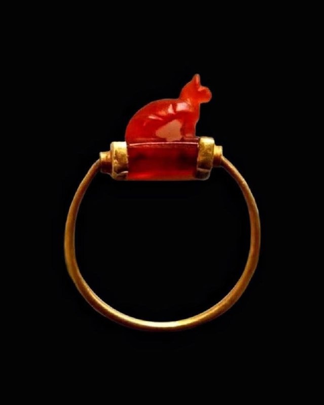 Символы в украшениях ✨✨✨✨ Кошка — это символ хитрости, красоты, изящества, интуиции, силы и независимости. Считается ещё, что кошка защищает своего обладателя от завистников и негативного влияния. #историяукрашений На фото - древнеегипетское золотое кольцо с сердоликовым ободком, на котором вырезана кошка. датируется 1070-712 годами до н. э. ✨✨✨✨ А как вы относитесь к кошачьим символам? Есть у вас такие аксессуары?