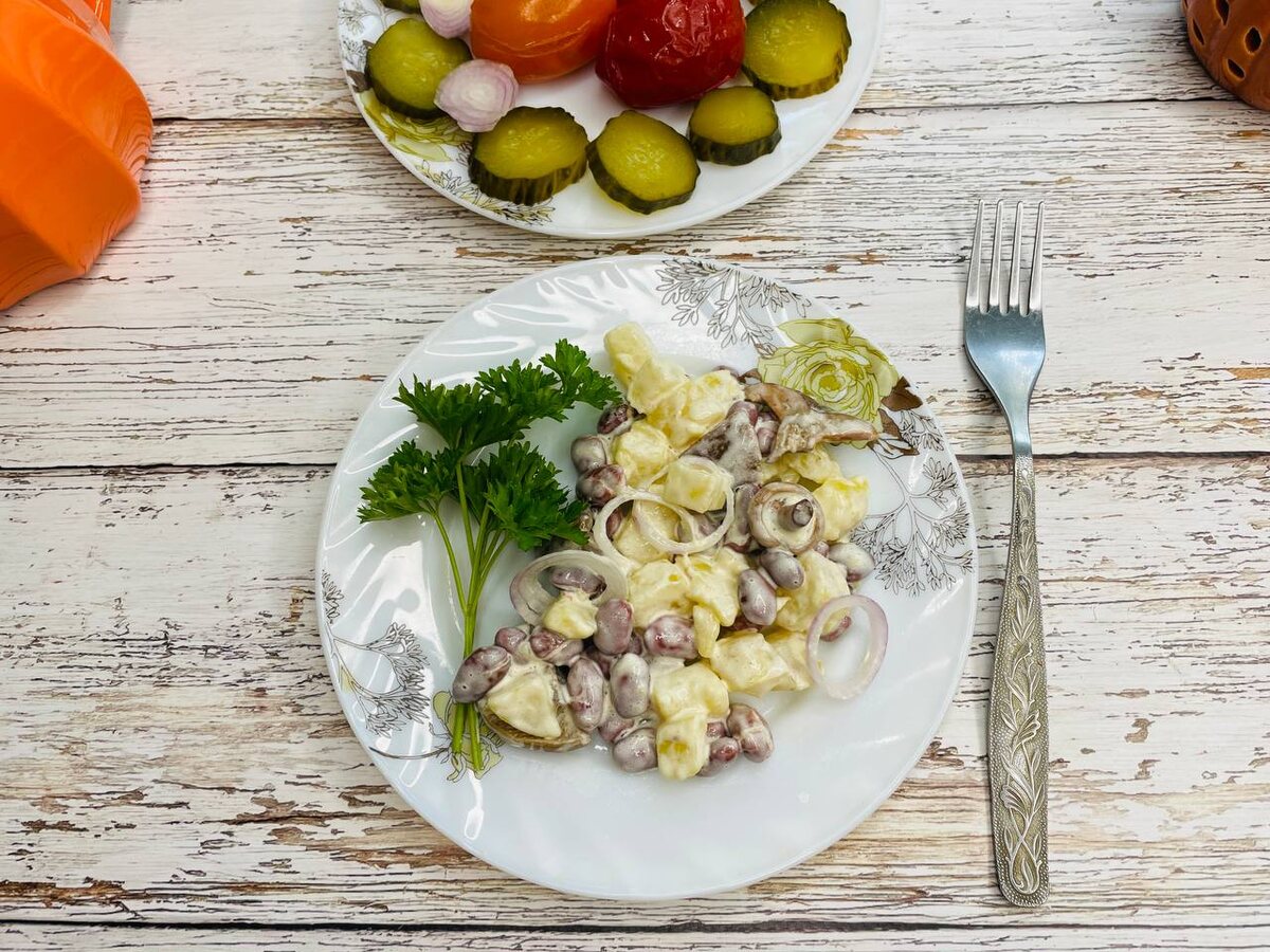 Хочу предложить приготовить этот салат. У него пикантный вкус с лёгкой кислинкой. Салат очень сытный и вкусный. Рецепт придумала сама. Все продукты, кроме фасоли, из личного огорода. Ингредиенты: маринованные рыжики 150г, консервированная красная фасоль 1 банка 420г, отварной картофель 200г, маринованный кабачок 100г, лук-шалот красный 50г. Рыжики порезать: Фасоль промыть холодной кипячёной водой: Картофель порезать кубиками: Маринованные кабачки порезать кубиком: Всё смешать с майонезом (без фанатизма). И украсить кольцами лука. Приятного аппетита! Жду отзывов в комментариях, ели ли вы такой салат.