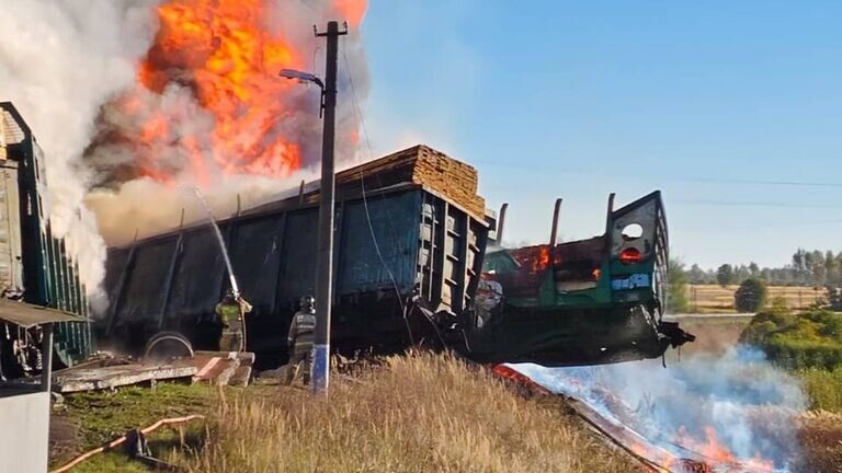Сегодня, 26 сентября, в районе станции Рыжиково на железнодорожном переезде столкнулись грузовой поезд и фура. С рельсов сошли локомотив и 18 вагонов с бензином. Начался пожар.