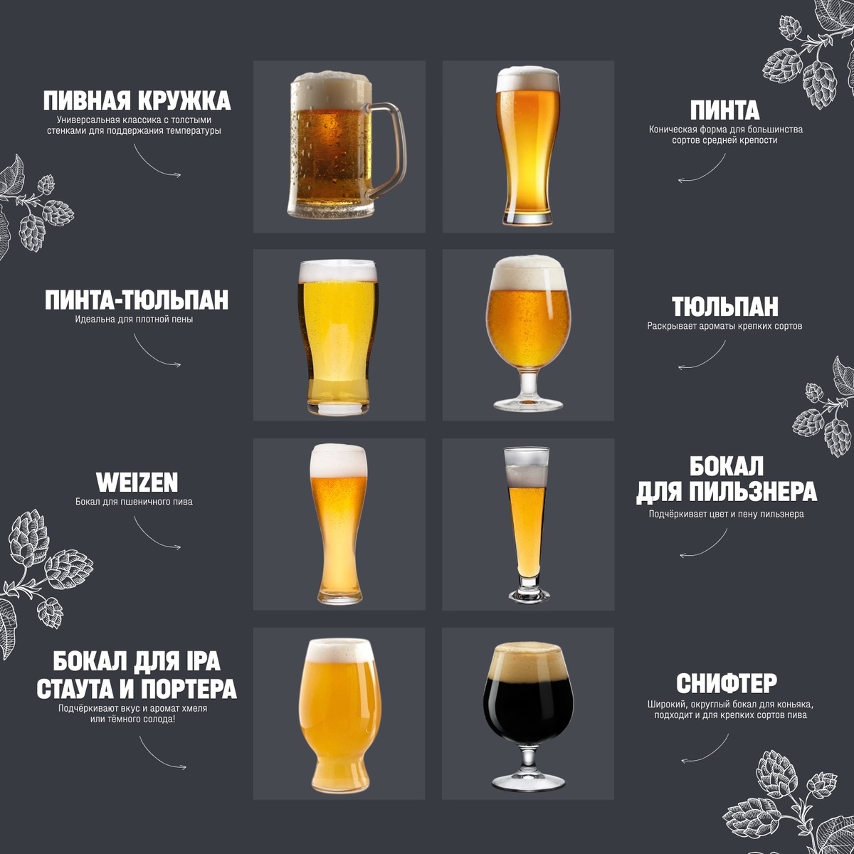 Задумывались, почему пивные бокалы такие разные? Дело в форме! Разная посуда раскрывает разные грани вкуса любимого напитка! Итак, краткий гид по пивным бокалам: - Пивная кружка: Универсальная классика с толстыми стенками для поддержания температуры. Подходит для лёгких лагеров и элей. Не для крафта! - Пинта: Коническая форма для большинства сортов средней крепости. Пинта-тюльпан идеальна для плотной пены! Пшеничное, ирландские эли, стауты - ваш выбор! - Тюльпан: Изящный бокал на ножке, сужающийся кверху. Раскрывает ароматы крепких сортов! Бельгийские эли, стауты, IPA - отлично! - Weizen: Высокий, расширяющийся бокал для пшеничного пива. - Бокал для пильзнера: Сужающийся книзу конус. Подчёркивает цвет и пену пильзнера. - Бокал для IPA, стаута и портера: Для IPA - узкий, для стаута/портера - большой, с извилистым силуэтом. Подчёркивают вкус и аромат хмеля или тёмного солода! - Снифтер: Широкий, округлый бокал для коньяка, подходит и для крепких сортов пива! Раскрывает хмельные ароматы.