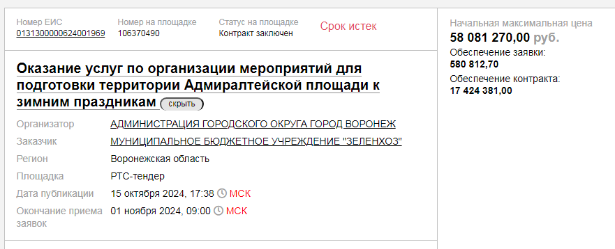 скриншот сайта госзакупок, прошлогоднее объявление торгов на подготовку Адмиралтейской площади к зимним праздникам