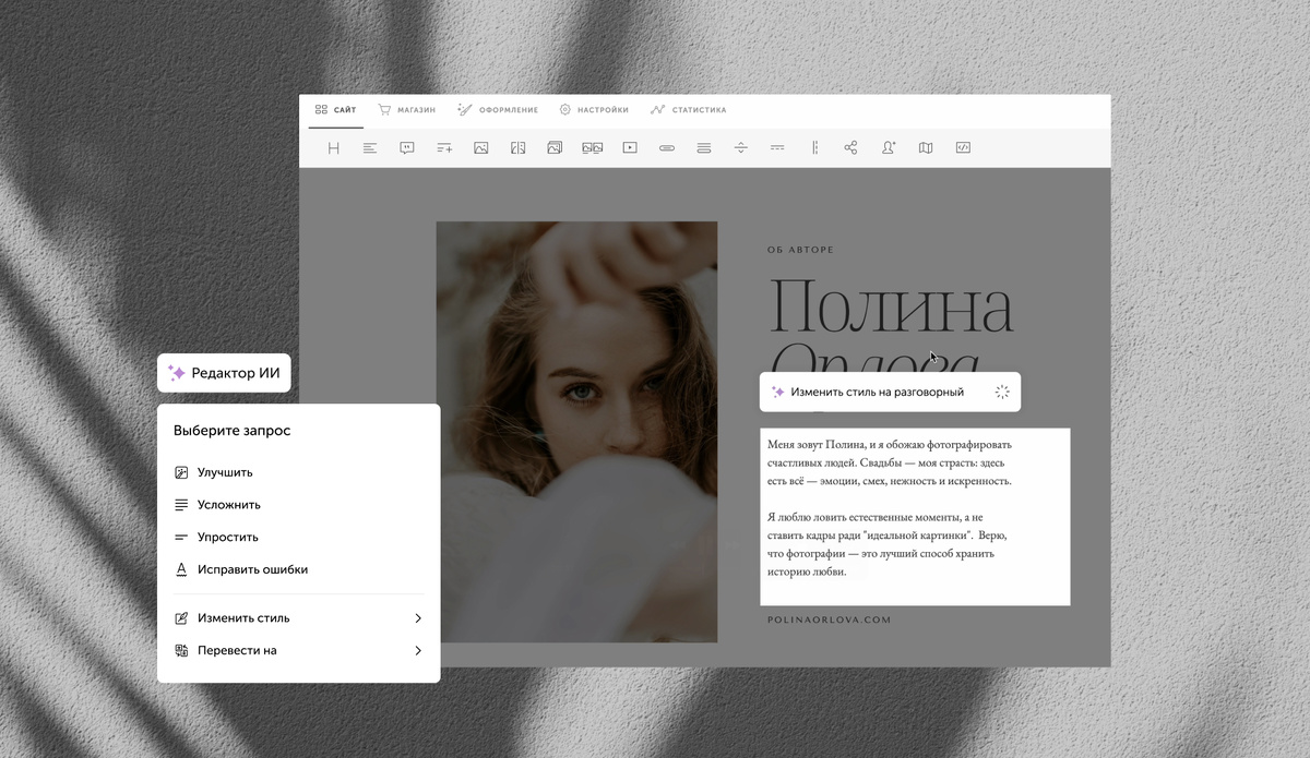 ИИ-помощник поможет быстро написать блок «О себе», описать услуги или статью в блоге. Меняйте стиль, улучшайте текст, исправляйте ошибки и переводите на нужный язык — всё в пару кликов прямо внутри Vigbo ✨ Vigbo — первый сервис для фотографов на русскоязычном рынке, с 2011 года упрощаем работу мастеров и помогаем привлекать клиентов. Наша миссия — больше счастливых фотографов и красивых историй. Бесплатные галереи для передачи съемок, онлайн ретушь и сайт-портфолио для фотографов – всё в одном месте! Регистрируйтесь >> Если материал вам был полезен, просто кликните на 👍 и делитесь с друзьями ссылкой ❤