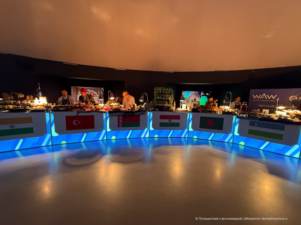 Пока в залах обсуждают строительство энергоблоков и научное сотрудничество, внизу происходит другой процесс. Участники форума фотографируются с турецкой пахлавой, пробуют венгерские колбаски, разбирают египетские хаваши.