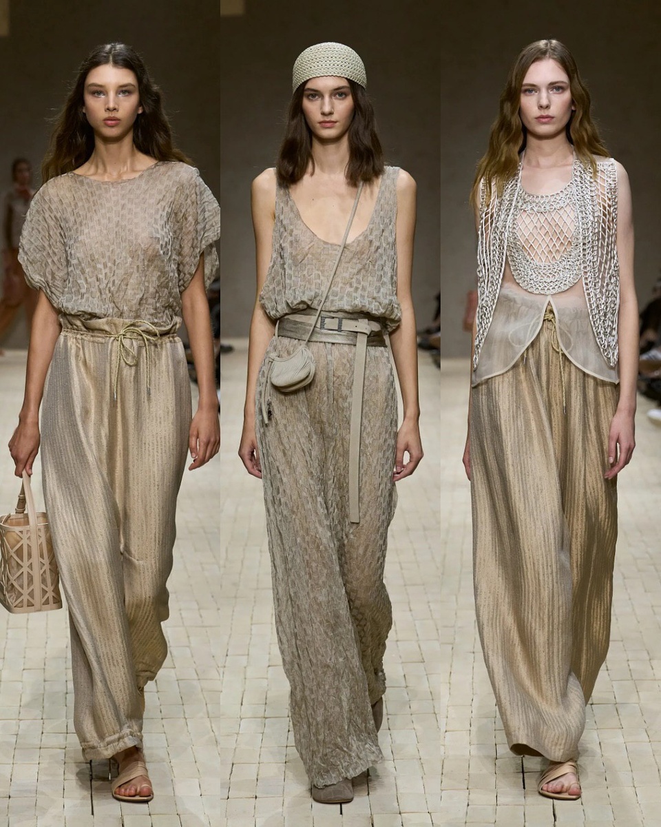 Сценография Emporio Armani в миланском Armani Teatro в этот раз напоминала ступенчатую пирамиду. Четыре яруса, словно древний зиккурат, обрамляли подиум, по которому модели двигались в полной тишине. Это была первая коллекция бренда после смерти Джорджо Армани. Никто не вышел покланиться в финале, и зрители, среди которых были Наталия Брайант, актрисы Бай Лу и Барбара Ронки, не сдерживали слёз. Шоу было одновременно тяжёлым и лёгким: оно вспоминало Маэстро и отпускало его, приглашая смотреть вперёд. Источником вдохновения стали ощущения путешественников, которые возвращаются домой из отпуска, ещё не расставшись с ароматами далеких стран . Коллекция открылась песочными и медно‑нейтральными оттенками, подчёркнутыми мягкими фактурами: лёгкие плащи из хлопкового твила, жилеты из замши и шелковых гобеленов, свитера из рифленого хлопка . Постепенно цветовая палитра насыщалась: к бежевому добавлялись персиковый, сиреневый, нежно‑голубой и тёплый изумруд. Завершающие выходы «взорвались» фейе