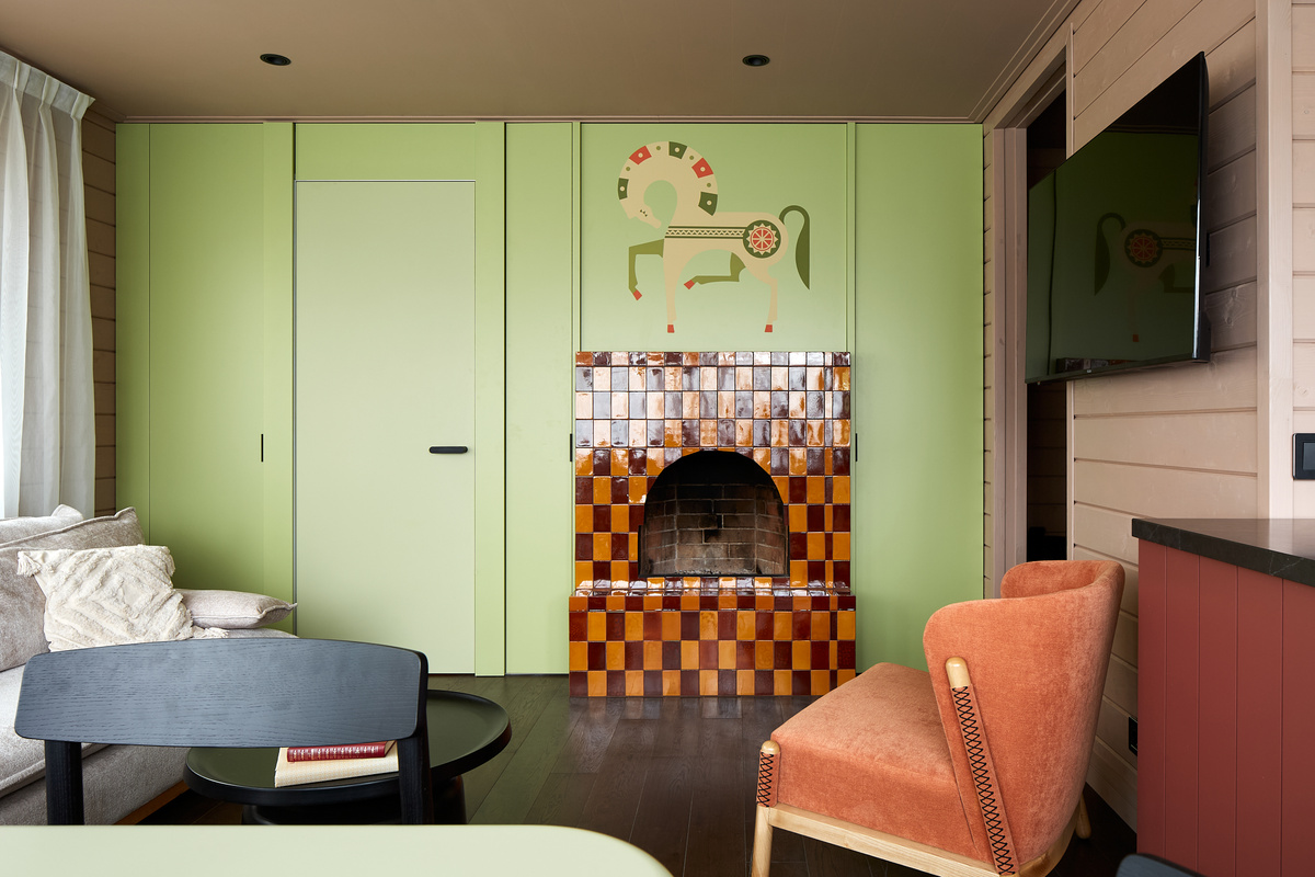Современный интерьер — это не просто сочетание цветов и мебели, но и отражение смыслов, индивидуальности и настроения пространства. В представленном проекте кухня-гостиная в загородном доме становится таким примером гармоничного объединения смыслов народного творчества и современных дизайнерских тенденций, а изделия Ultrawood помогли сделать помещение аккуратным и законченным. Центральным акцентом стала стена с камином, окрашенная в оттенок свежей летней зелени — цвет, который привносит ощущение природной свежести и жизненной энергии. Этот насыщенный тон умело сбалансирован с приглушёнными компаньонами, что исключает эффект излишней яркости и создает комфортное, сбалансированное пространство. Дизайнеры также мастерски интегрировали элементы народного творчества, реализовав концепцию фолк-фьюжн. В центре композиции — стилизованная деревянная лошадка с традиционными славянскими узорами, символизирующая плодородие и весну. Этот символ приобретает особое значение в интерьере, рассчитанн