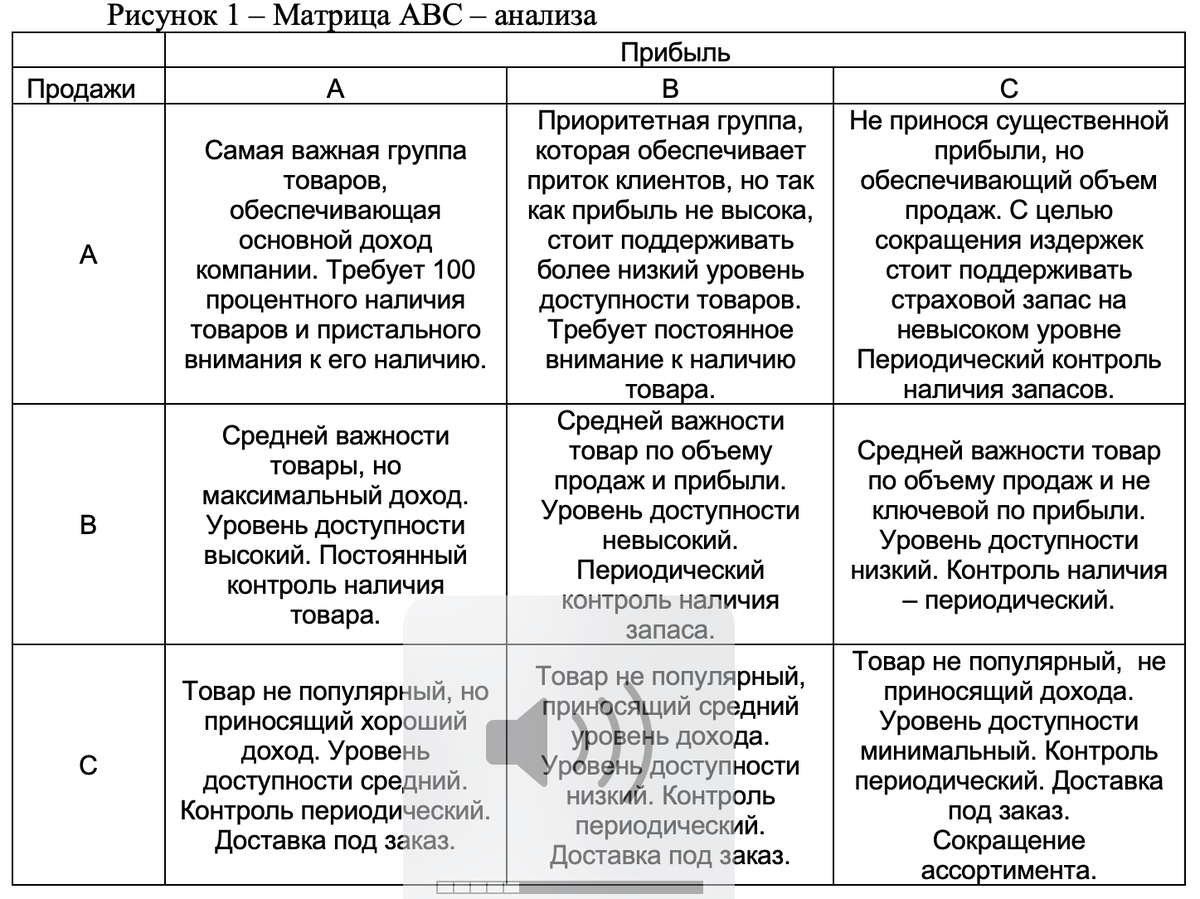 АВС – анализ. Позволяет изучить массив данных и выявить ту часть, которая обеспечивает максимальный эффект. В нашем случае, взяв за отправную точку наш ассортимент, анализируем его по двум параметрам: объем продаж и получаемую прибыль. После получения некой матрицы (Рисунок 1) принимаются начальные управленческие решения.