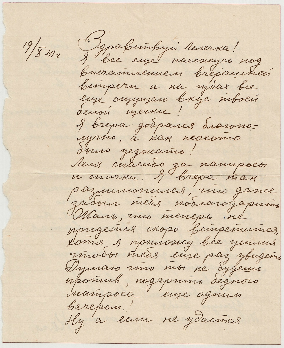 Этому письму уже около 84 лет... Ни автора, ни адресата я, конечно же, не знаю, как и их дальнейших судеб. Да и любые предположения здесь неуместны. Ибо первая блокадная осень ещё до голодов и холодов всё же вряд ли сулила новую и скорую встречу. Вроде бы обычное прощание ленинградского матроса с любимой девушкой... Коля и Лёля... Выжили они или погибли, как многие - неведомо.