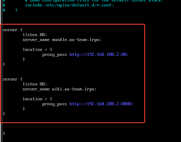 Настройте веб-сервер nginx как обратный прокси-сервер на HQ-RTR Установка Nginx # dnf install nginx -y Запуск и добавление в автозагрузку # systemctl enable --now nginx Открываем на редактирование конфигурационный файл Nginx # nano /etc/ nginx/nginx.conf Cпускаемся в конец документа и перед последней фигурной скобкой { прописываем server {