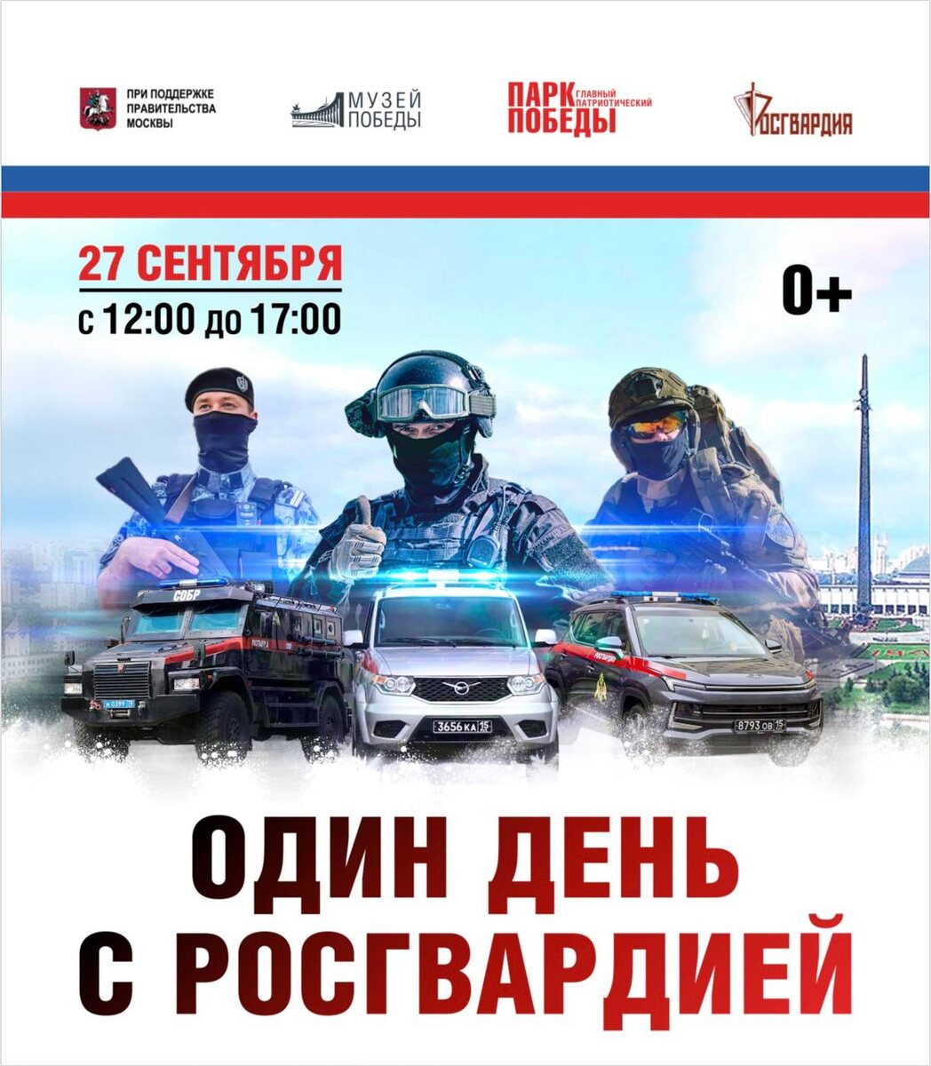 🫡 Культурно-просветительское мероприятие «Один день с Росгвардией» пройдет на Поклонной горе в Москве 📅Уже завтра, 27 сентября, с 12.00 до 17.00 на площадках проекта «Парк Победы. Главный патриотический» приглашаем всех интересно провести «Один день с Росгвардией». В программе : 🎼 Для любителей духовой музыки и красивой формы - марш-парад военного оркестра штаба Центрального округа Росгвардии. 🪖 Для ценителей экшена - эффектные показательные выступления военнослужащих 55-й дивизии войск национальной гвардии. 🚗 Для фанатов настоящих машин - военная техника, а также вооружение и все, что с ним связано 🛩 🐂Спортивные активности и автограф-сессия с титулованными спортсменами Росгвардии. ✅Также в программе: передвижная экспозиция Центрального музея Росгвардии, концерт творческих коллективов, интерактивный тир и много чего интересного. ❤️Ждём вас на Поклонной горе, чтобы провести один день вместе с Росгвардией! Вход на мероприятие свободный. P.S. Праздник состоится, невзира