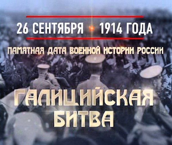 26 сентября - Памятная дата военной истории России. Галицийская битва Одно из крупнейших сражений Первой мировой войны, в результате которого русские войска заняли почти всю восточную Галицию, почти всю Буковину и осадили Перемышль. В операции участвовали 3-я, 4-я, 5-я, 8-я, 9-я армии в составе русского Юго-Западного фронта и четыре австро-венгерские армии, а также германская группа генерала Ремуса фон Войрша.