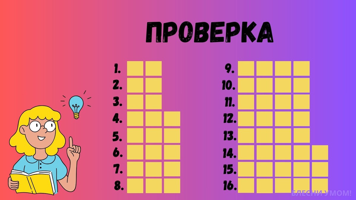 Сегодня у нас лингвистическая разминка: из одного слова нужно составить как можно больше других. Проверь свою внимательность, словарный запас и скорость мышления! В слове "Проверка" спрятано много слов. Сможешь составить хотя бы 16 - значит твой мозг работает в активном режиме. Условия: 👉Все слова должны быть употребляемыми существительными в единственном числе, именительном падеже. 👉Имена и географические названия не употребляем. 👉Сленг и жаргон не применяем. Вперёд, друзья! Всё получится! Как ваши успехи? Сумели найти все слова? ✍Тогда напишите в комментариях что удалось увидеть. Подписывайтесь, чтобы не пропустить новые интересные задания для тренировки мозга! Ещё больше головоломок 👉ищи здесь👈!