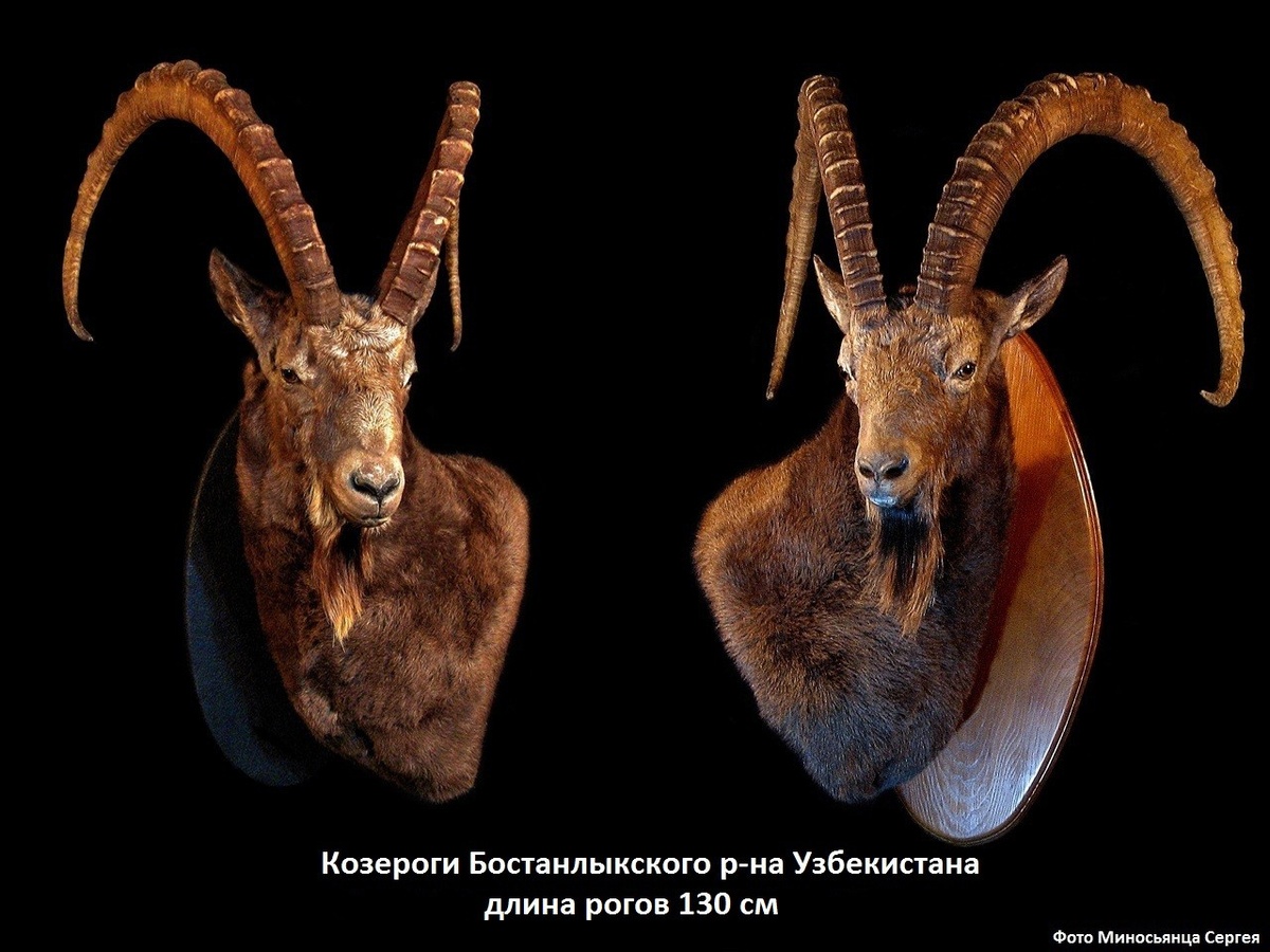 Сибирский козерог на территории Узбекистана является обычным охотничьим видом и часто попадает к таксидермистам. Материалы, собранные мной, получены у охотников г. Ташкента, г. Газалкента и пос. Бричмулла и касаются Бостанлыкского района Ташкентской области. Меня, прежде всего, интересовали крупные рога козерога, длиной 130 см и более.