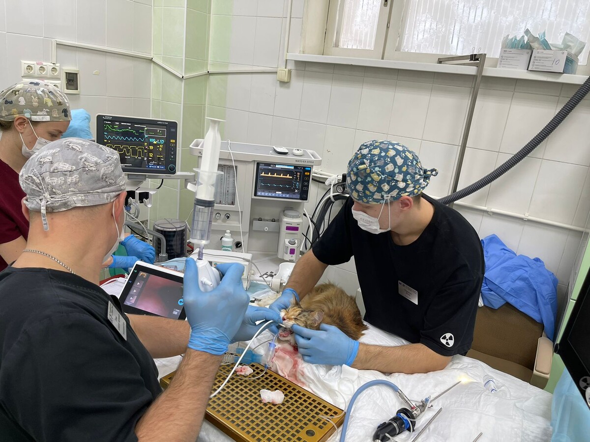 Зимой владелец кошечки Шелли впервые обратилась к нам с затрудненным дыханием. После диагностики и назначенной терапии наблюдалась положительная динамика в течение 4 месяцев. Казалось, проблема решена. Но летом ситуация обострилась: снова появились выделения из носовых ходов, а затем и кровянистое отделяемое. При осмотре обнаружили, что дыхание затруднено преимущественно с правой стороны. Тест со стеклом показал, что левая ноздря «припотевает» (есть воздухопроходимость), правая — почти нет. По КТ было диагностировано новообразование в носовой полости (с обеих сторон, но больше слева). Гячас Алексей Арунович провел риноскопию — эндоскопическое исследование носовых ходов. Взяли материал на гистологическое исследование (ожидаем результат, который покажет природу образования). Назначили поддерживающую терапию и ждем ответа от гистологии, чтобы назначить специфическое лечение. Будем держать вас в курсе новостей Шелли 💪❤️ Подпишитесь на уведомления, чтобы не пропустить