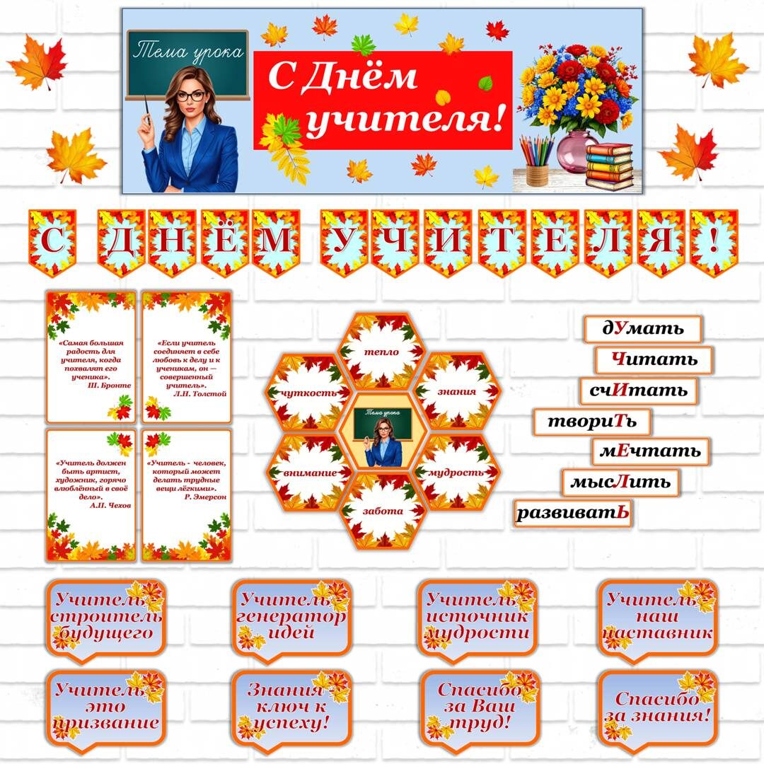 Красивое оформление класса ко Дню учителя подарит радостные эмоции педагогам и обучающимся. Каждый элемент разработки продуман и создаст праздничную атмосферу, а также подчеркнёт значимость профессии учителя. Пусть этот день запомнится всем теплотой и радостью! Все материалы готовы к печати на листах А4. Есть редактируемый формат, вы сможете изменить тексты или дополнить методическую разработку по своему вкусу. Оформление включает в себя: 1. Плакат (4 части формата A4). 2. Высказывания известных людей о профессии учителя (4 листа формата А4). 3. Флажки «С Днем учителя!» (по 2 флажка на листах А4). 4. Речевые облака (8 штук формата А4). 5. Гексы (7 штук формата А4). 8. Слова с выделенными буквами, из которых складывается слово «учитель». 9. Элементы декора: букеты из осенних листьев и осенние листья (в редактируемом файле вы сможете настроить нужный вам размер). Оформление скачать здесь Редактируемые приглашения на праздничное мероприятие скачать здесь Открытки для поздравления учителей