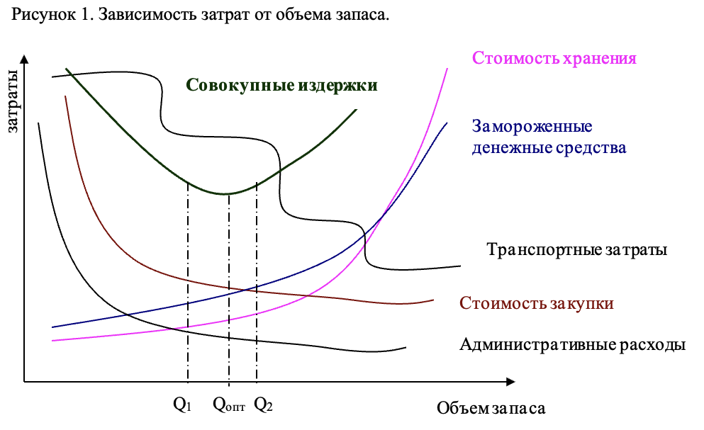 Вопрос, – «в каком объеме хранить запасы?» непосредственно связан с оборачиваемостью запасов. Чем больше запас в аптеке, тем дороже обходится его поддержание. Здесь вступают в силу несколько статей затрат (рисунок 1). С другой стороны, чем меньше уровень поддерживаемого запаса, тем выше риски и выше вероятность возникновения дефицита.