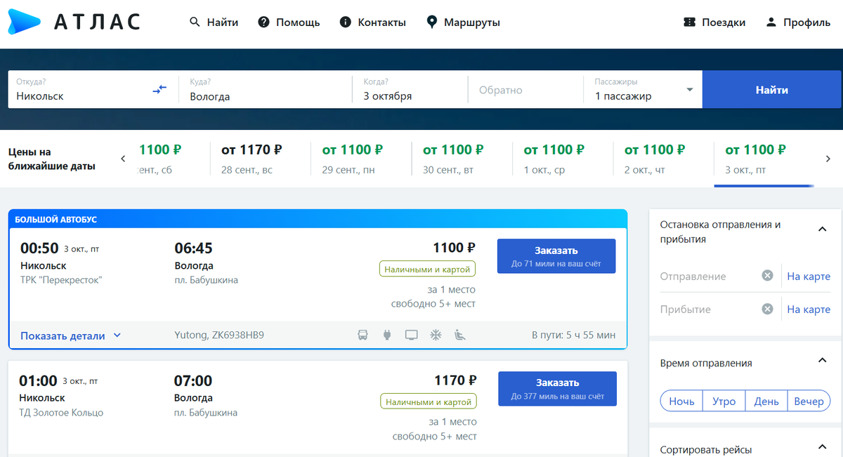 Предлагаем несколько удобных вариантов. Маршрутка или автобус сегодня остаются самым популярным и надежным способом добраться из Никольска до Вологды и обратно. Например, только в сервисе Атлас для пассажиров ежедневно доступны 8 рейсов по этому направлению. Билет на них можно купить, не выходя из дома. Достаточно лишь зайти на сайт Атласа или же скачать приложение. Дальше выбираем откуда и куда хотим поехать, а также дату отправления. После выбираем остановки и способ оплаты. Для пассажиров доступны два варианта. Можно забронировать билет и потом оплатить поездку у водителя. Но самый удобный вариант – онлайн-покупка. В этом случае даже наличные можно не брать с собой: пассажир получит электронный билет установленного образца. Стоимость билета от способа оплаты не зависит. Сейчас поездка по маршруту «Никольск-Вологда» обойдется в сумму от 1100 рублей. Время в пути – 6 часов. Доступны опции онлайн-покупки и бронирования билетов и для жителей населенных пунктов по маршруту автобуса. Сре