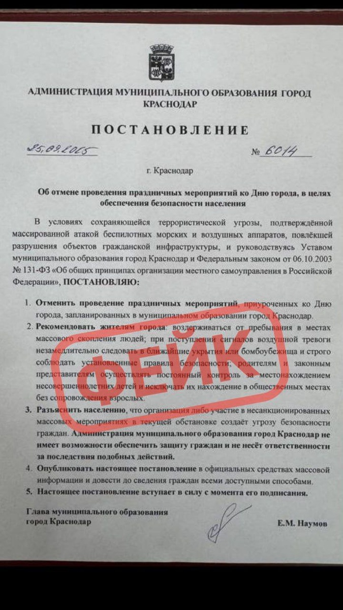 В мэрии опровергли информацию об отмене празднования Дня города "В соц.сетях и пабликах распространяется информация, якобы об отмене праздничных мероприятий ко Дню города, в публикациях используются фотографии поддельного постановления и видоизменённые картинки, которые ранее публиковались на официальных страницах администрации. Это — фейк! Все запланированные мероприятия состоятся. В Краснодаре предприняты необходимые меры безопасности", – сообщили в мэрии 💜 Мы в MAX 👍 ТК Краснодар | Подписаться