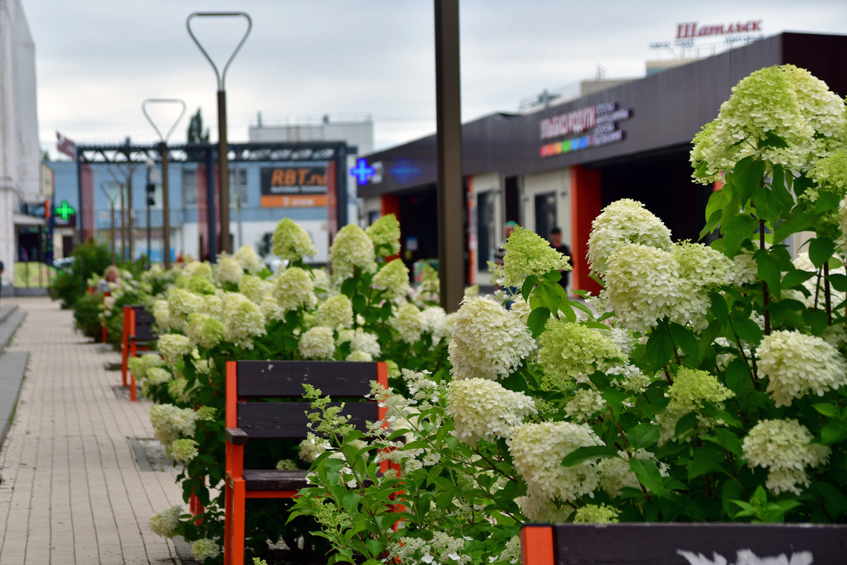Особенно хороши эти декоративные кустарники на пригорке Елочной площади с соцветиями нежно-лилового цвета. Глаз не оторвать! Впрочем, также хороши эти удивительные цветы на рыночной улице – здесь они разные. От ослепительно белого до темно-бордового цвета, стоят, горделиво покачиваясь от легкого ветерка.