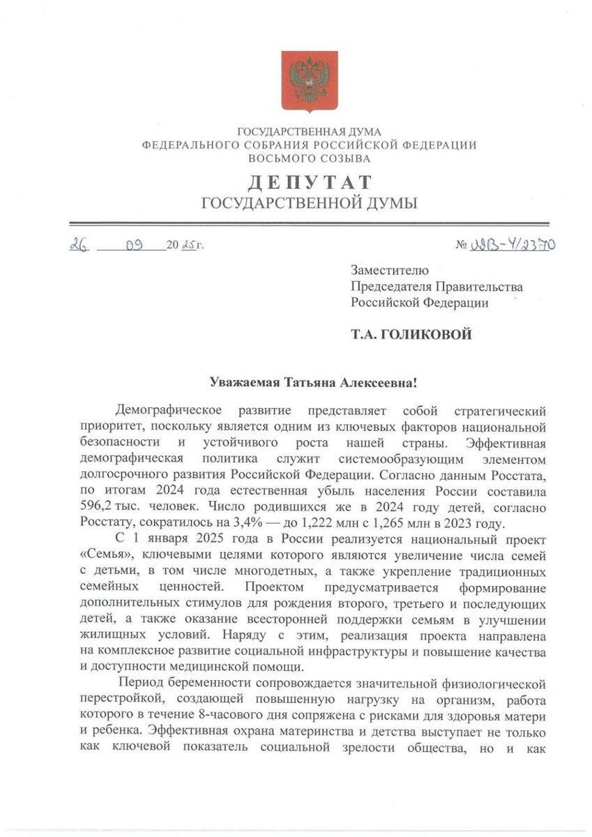 Беременная женщина должна иметь право работать не 8 часов, а 6 — и получать при этом полную зарплату Письмо с таким предложением вместе с лидером фракции СРЗП Сергеем Мироновым направили вице-премьеру Татьяне Голиковой. 📑Согласно статистике, на сегодняшний день естественная убыль населения превысила 596 тысяч человек, рождаемость падает второй год подряд. Запущен нацпроект «Семья», но если мы хотим, чтобы семьи смело рожали вторых и третьих детей, нужно создавать реальные условия для этого. Сейчас нередко будущей маме приходится выбирать между здоровьем ребёнка и своей работой. Беременность — это огромная нагрузка на организм. А 8-часовой рабочий день для многих становится непосильным трудом. 📌Мы предлагаем закрепить в Трудовом кодексе право на 6-часовой рабочий день с сохранением зарплаты. Такая мера поддержки снизит риски для здоровья матери и малыша. Также считаем, что инициатива в целом будет способствовать уменьшению стресса и страха перед финансовыми потерями, повысит увер