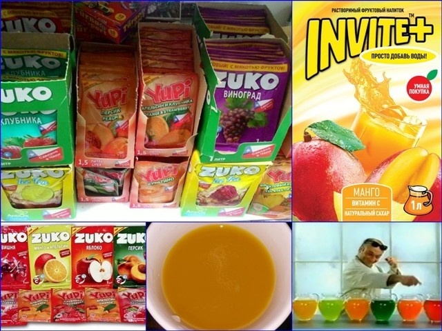 Порошковые «соки» Yupi, Invite и Zuko были хитами благодаря простоте приготовления: достаточно развести содержимое пакетика в воде, чтобы получить сладкий напиток кислотных оттенков. Их любили не только дети, но и взрослые, создавая на основе порошков коктейли с водкой.