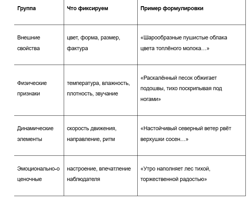 Научившись фиксировать и упорядочивать признаки, вы сможете создавать запоминающиеся, образные тексты-описания, которые оживят любую сочинительскую задачу.