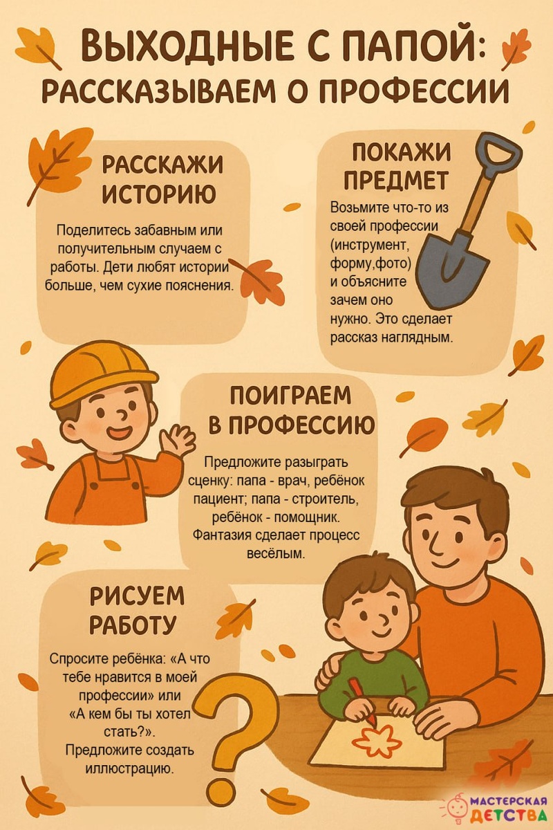 💭 Выходные с папой Иногда самое ценное, что мы можем подарить детям, — это не игрушки и развлечения, а наш опыт и истории. Расскажите ребёнку о своей профессии: что вы делаете на работе, как проходят ваши будни, почему это важно. 📌 Что это даёт ребёнку: — понимание, что труд — это ценность — новые знания и расширение кругозора — уважение к профессиям и желание учиться — доверие и близость в общении с папой А чтобы разговор был ещё интереснее и нагляднее — используйте комплекты демонстрационных картинок по профессиям разных направленностей от издательства «Творческий Центр СФЕРА» С его помощью вы сможете: - познакомить ребёнка с профессиями первых наставников - обсуждать, чем отличается труд учителя, воспитателя, библиотекаря - закреплять материал с помощью вопросов и игровых заданий - развивать память, внимание и мышление ребёнка в лёгкой форме 😁 В комплекте — 12 ярких картинок с описанием профессий, карточки с предметами и заданиями, а также методические рекомендации для родит