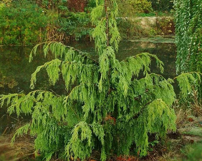 Кипарисовик нутканский (Chamaecyparis nootkatensis) был открыт для науки в 1793 году во время экспедиции по северо-западному побережью Северной Америки. Название он получил от географического объекта — Нутка Саунд (Nootka Sound), бухты на западном побережье острова Ванкувер в Канаде, где его впервые описали европейцы. Местные индейские племена знали и использовали дерево задолго до «официального признания» ботаников: оно ценилось за прочную древесину и духмяный аромат хвои. Кипарисовик нутканский — это вечнозелёное хвойное дерево семейства кипарисовых. В природе он может достигать 30–40 метров в высоту, а иногда и выше, становясь настоящим лесным гигантом. Крона чаще всего узкоконическая, стройная, а ветви слегка поникают вниз, создавая ощущение «драпировки» из хвои. Именно благодаря этой плакучей форме он напоминает мистический лесной шатёр. Хвоя у него мелкая, чешуйчатая, с голубовато-зелёным или серебристым оттенком (в зависимости от сорта и условий), она выделяет характерный аромат