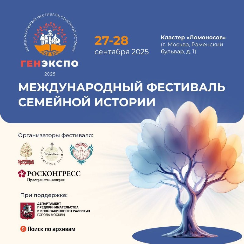 27 и 28 сентября в кластере «Ломоносов» (Раменский бульвар, 1) пройдёт Фестиваль семейной истории «ГенЭкспо». Это событие объединит всех, кто хранит и изучает память о своих корнях: генеалогов, архивистов, дизайнеров родословных древ, авторов книг, представителей музеев, а также известных экспертов и блогеров. «ГенЭкспо» — пространство открытых диалогов, вдохновения и поиска новых связей между прошлым и будущим. Здесь каждый найдёт идеи для сохранения семейных традиций и передачи их следующим поколениям. Вход свободный. Регистрация обязательна по ссылке: 👉 https://t.me/GenExpo_bot?start=link_88BDlvbHvojKvO