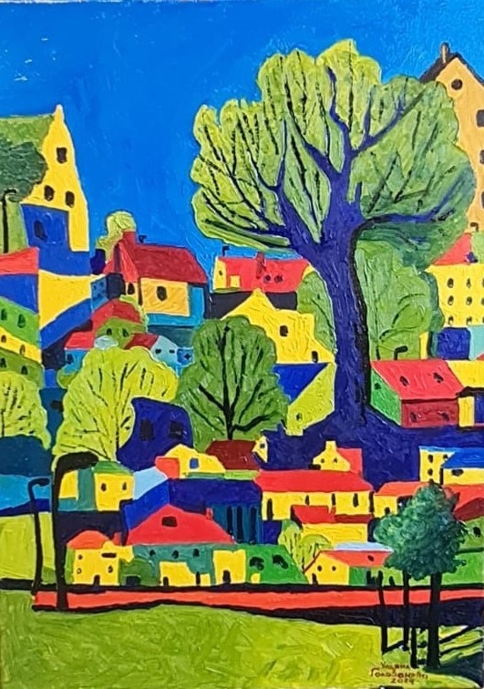 Картина, изображающая яркий пейзаж с домиками и большим деревом, вызывает множество эмоций благодаря своему насыщенному цвету и музыкальному ритму форм. Автор использует контрастные оттенки, что придаёт работе динамичность и радостное настроение. Архитектура на картине составляет интересный симбиоз, где дома разных форм и размеров аккуратно вписываются в окружающий ландшафт. Применение выразительных линий и упрощённых форм создаёт ощущение легкости и игривости. Дерево в центре работы становится символом жизни и устойчивости, занимая доминирующую позицию в композиции. Особое внимание привлекает цветовая палитра. Яркие синие, зелёные и жёлтые тона вызывают ассоциации с летом и счастливыми моментами, создавая атмосферу уюта и гармонии. Это позволяет зрителю не только любоваться картиной, но и ощущать себя частью этого места, находя в нём свою историю. В целом, данное произведение может быть интерпретировано как отражение внутреннего мира художника, стремящегося показать красоту повседневн