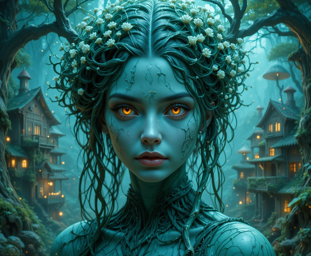 В этот момент из-за ствола ближайшего дерева появилась тень. Существо вышло бесшумно, не нарушив гармонию звуков. Это была девушка, но сотканная из самого леса. Её кожа была цвета молодого плюща, с перламутровым отливом. Вместо волос с головы струились живые побеги, усеянные мелкими белыми цветами, которые колыхались в такт её дыханию. Глаза, цвета тёплого янтаря, смотрели на Алисанту с бездонным, древним спокойствием.