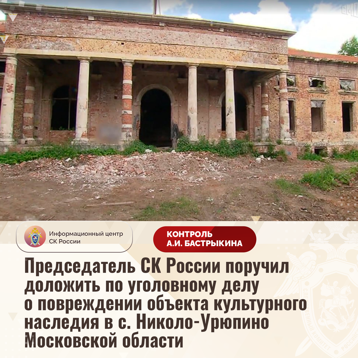 Председатель СК России поручил доложить по уголовному делу о повреждении объекта культурного наследия в с. Николо-Урюпино Московской области В эфире федерального телеканала сообщалось о повреждении объекта культурного наследия регионального значения «Усадьба «Никольское-Урюпино» в селе Николо-Урюпино Красногорского городского округа Московской области. На протяжении длительного времени памятник архитектуры, возведенный в 18 веке, находился в аварийном состоянии в связи со значительным износом, разрушением и частичным уничтожением конструкций при пожаре. В текущем году подрядной организацией начаты реставрационные работы, в ходе которых демонтированы сваи, укреплявшие фундамент. В сентябре текущего года произошло обрушение фасада и колоннады одного из зданий. Отмечается, что собственник комплекса умышленно совершает действия, направленные на уничтожение строений. В ГСУ СК России по Московской области возбуждено уголовное дело. Председатель Следственного комитета Российской Федерации Але