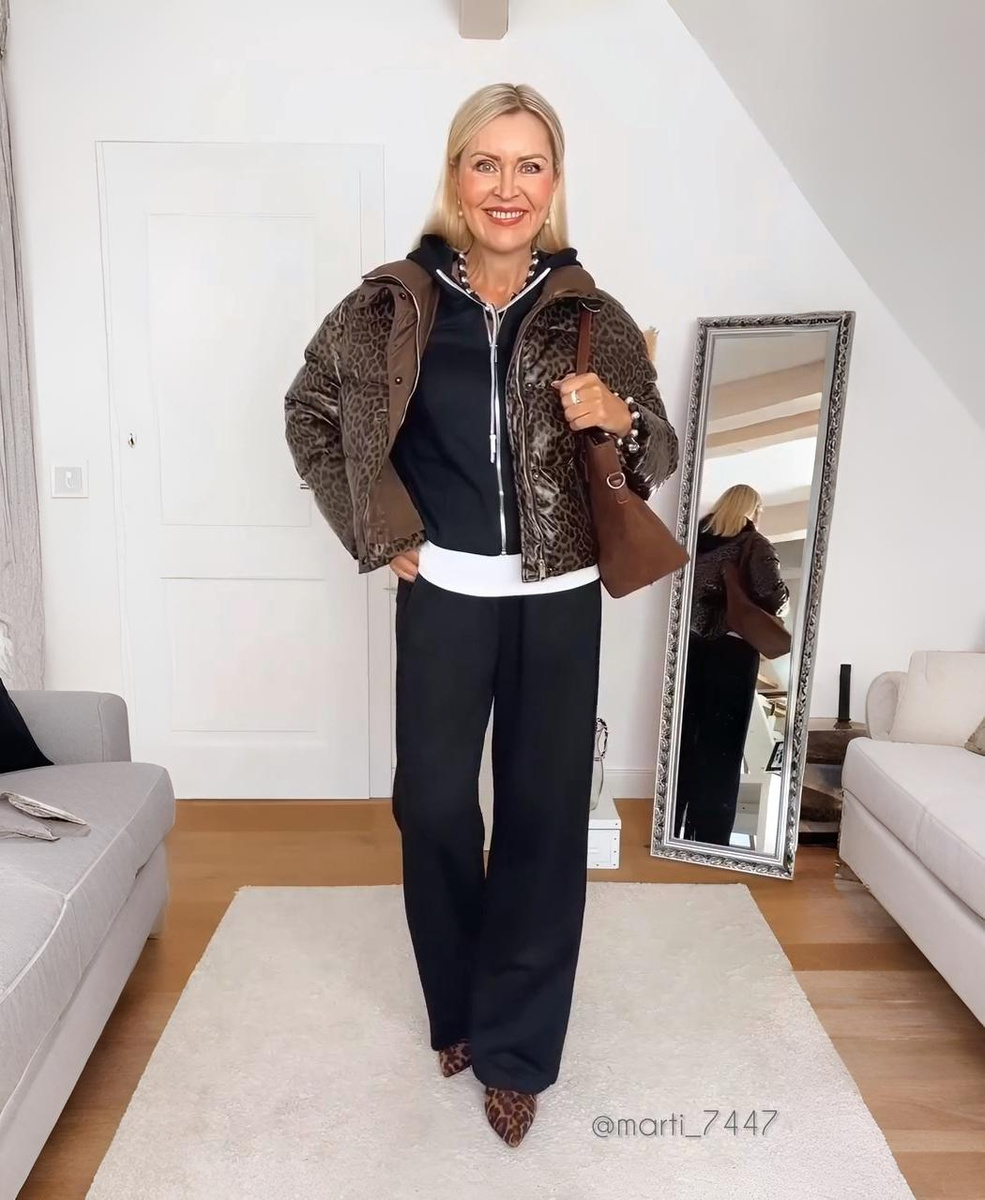 Осень – время, когда хочется укутаться в уютные ткани, но при этом выглядеть стильно и актуально. Если вы ищете вдохновение для создания осенних образов, то обратите внимание на немецкого блогера Марту Дахлхов. Ее стиль отличается практичностью, комфортом и умением сочетать тренды с классикой. Сегодня мы разберем 10 её повседневных образов, которые идеально подойдут для прохладных осенних дней. Черный спортивный костюм – основа образа, обеспечивающая максимальный комфорт. Главный акцент – куртка леопардовой расцветки, которая делает образ более смелым и запоминающимся. В тон куртке подобрана леопардовая обувь, а завершает ансамбль коричневая замшевая сумка, смягчающая анималистичный принт. Брюки горчичного цвета гармонично сочетаются со стеганой курткой шоколадного цвета. Дополняет образ уютный и стильный коричневый шарф с интересным узором, добавляющий образу уюта и тепла. Белые кроссовки и компактная сумочка делают его завершенным и удобным для повседневности. Светлый укороченное па