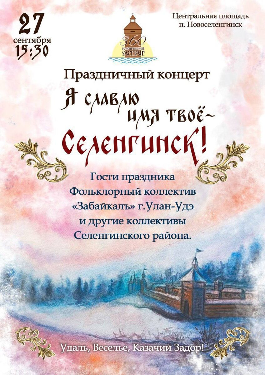 🎉 Уважаемые жители и гости Селенгинского района! Напоминаем, что завтра состоится большой праздник, посвящённый 360-летию Селенгинского острога! 🏰✨ Вас ждёт: ✅насыщенная культурная программа ✅выступления творческих коллективов ✅ярмарка и выставки ✅интерактивные площадки для всей семьи ✅праздничный концерт и многое другое! Для вашего удобства организован общественный транспорт: 🚌 Отправление из Гусиноозерска: 07:30 | 12:00 | 14:00 | 17:00 🚌 Отправление из Новоселенгинска: 08:05 | 12:35 | 14:35 | 17:35 Стоимость проезда: 200 руб. Диспетчерская служба: 8 (902) 1-60-10-64 Приглашаем всех вместе отметить важную дату в истории нашего района! Создадим атмосферу радости, единства и гордости за наше общее прошлое и настоящее! 🤝❤️ 📢 Не пропустите праздник 360-летия Селенгинского острога - ждём вас завтра! 🫡 Селенгинский район