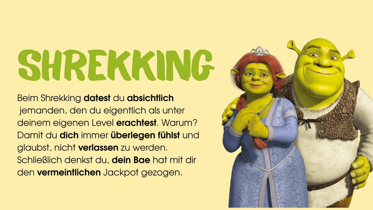 В мире свиданий и дейтинга появился новый тренд - Shrekking. Хоть это и англицизм (который, вероятно, вдохновлен немецким словом der Schreck - ужас), я решила рассказать про него здесь тоже, потому что он всё чаще встречается в соцсетях в дискуссиях про свидания и отношения. Оставляю описание со словариком важных слов ниже, а также перевод. Шрекинг — это когда ты намеренно встречаешься с человеком, которого ты считаешь ниже себя. Зачем? Чтобы всегда чувствовать себя лучше и верить, что вас не бросят. В конце концов, вы думаете, что ваш сорвала с вами джекпот. Хотите больше таких примеров? В моём Telegram-канале LETS DEUTSCH я регулярно публикую полезные разборы немецкой грамматики, живые примеры из жизни и, конечно, мемы. Присоединяйтесь!