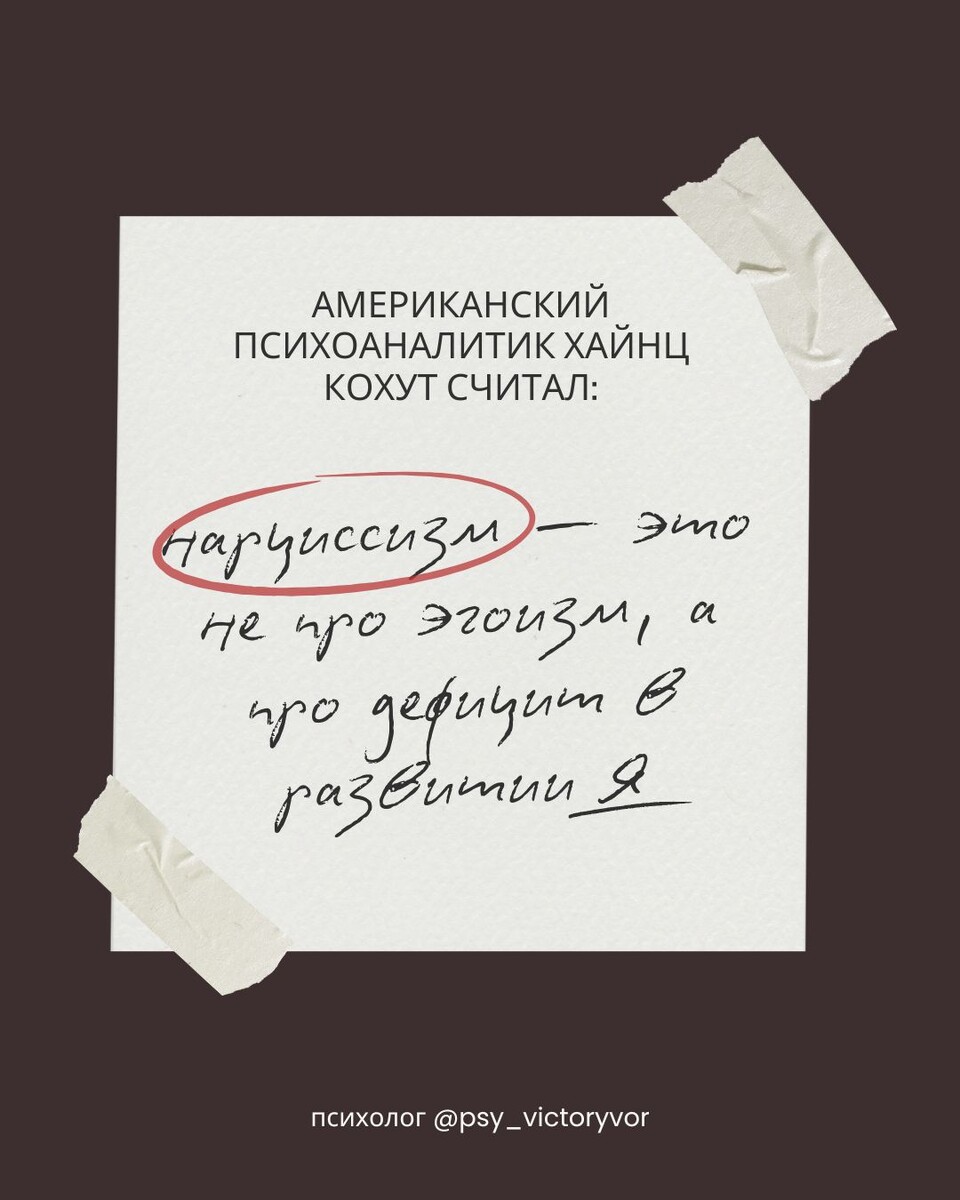 🧩 Например, психоаналитик Хайнц Кохут считал, что нарциссизм — это не про эгоизм, а про дефицит в развитии Я. 🔧 Из его теорий: существуют «самообъекты» - люди (обычно сначала родители), через которых человек формирует чувство собственного "Я". Например:Мама, которая восхищается тобой → ты чувствуешь себя особенным. Папа, который поддерживает → ты веришь, что можешь справиться. 👶 Он считал: что если в детстве не было стабильных, тёплых, восхищающихся взрослых, то "Я" вырастает хрупким, неуверенным. Внешне — человек может быть харизматичным, но внутри — уязвим как стекло. 🔍 Как это связано с расставанием? Кохут считает, что если нарциссическая личность в паре использует партнёра как самообъект, то:🔴 Любовь партнёра = подтверждение, что «я ценен». 🔴 Поддержка партнёра = «я справлюсь». 🔴 Восхищение партнёра = «я особенный». Когда этот человек уходит, то вместе с ним рушится самооценка, исчезает ощущение целостности. Это не «просто расставание», это крах внутреннего мира, потому что